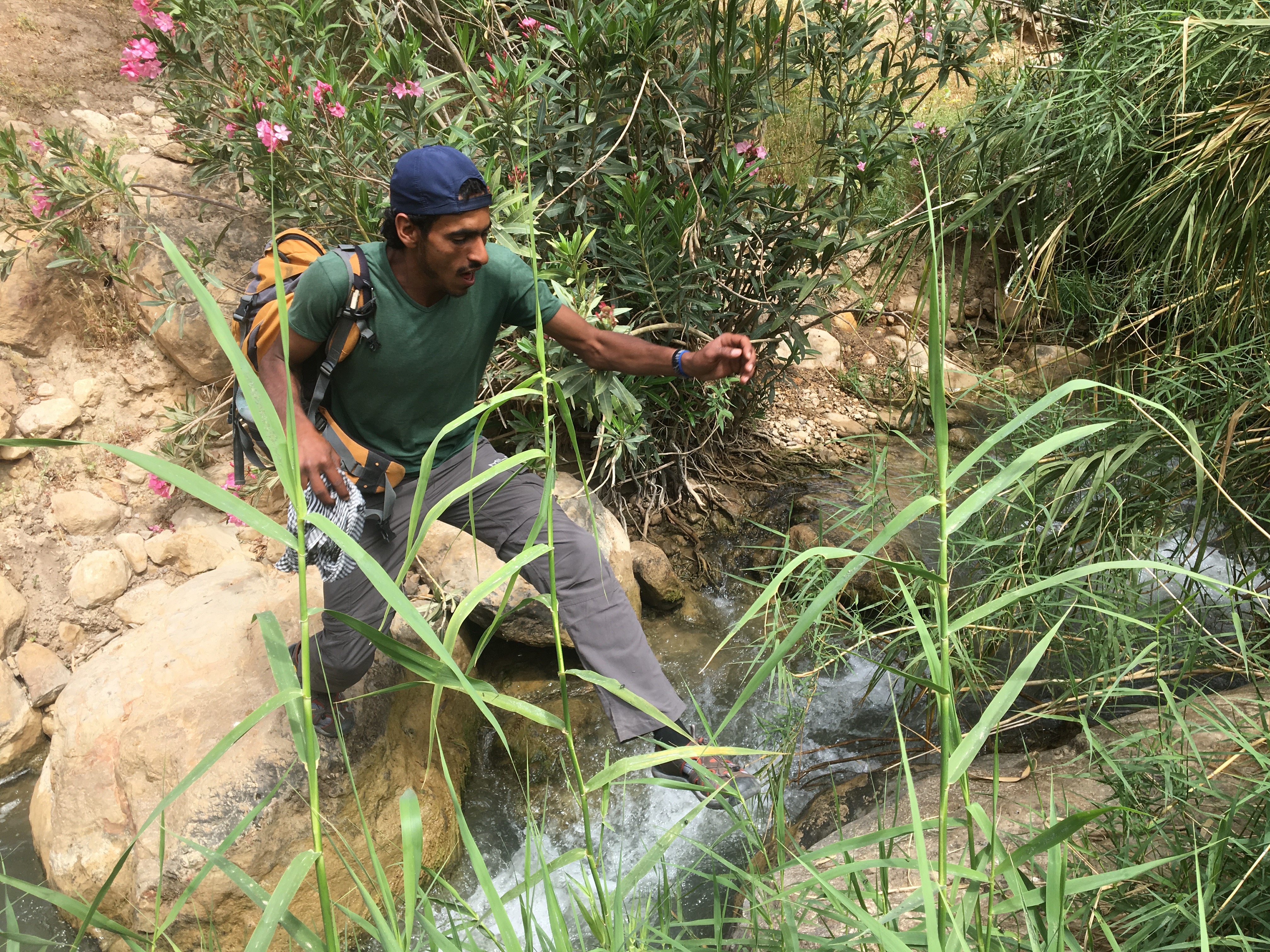 A estas alturas, nuestro grupo de senderistas había disminuido: habíamos menos de diez descendiendo en el valle, incluyendo algunos nuevos senderistas que se habían unido a nosotros para esta tercera sección de la ruta. Mientras tanto, el calor había aumentado, por lo que a las 9 de la mañana ya estaba sudando como un hombre que emerge después de 15 minutos en un sauna. Fue durante esta nueva ola de calor húmedo que encontramos a nuestro primer wadi - un claro río de agua de lluvia, que brotaba a través de las rocas, rodeado de bambú verde y arbustos de flores azules y olorosas. Uno por uno, saltamos de un lado a otro, abriéndonos camino a través de esa selva breve y sofocante antes de emerger en el otro lado y enfrentar la verdad: una pared casi vertical de tierra para la que no existe una manera fácil de subir.