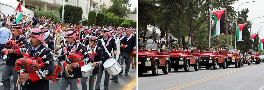 Al Saif, arquitecta e hija de una prominente familia saudí, es recibida por una banda que toca la gaita cuando llega a la boda en el Palacio Zahran de Jordania. / Un convoy de guardias reales se dirige hacia el Palacio de Zahran. [Ahmad Abdo/Reuters]